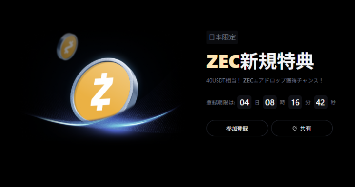 日本限定の新規ユーザー向けキャンペーン「ZECエアドロップ特典」が開催されています。